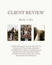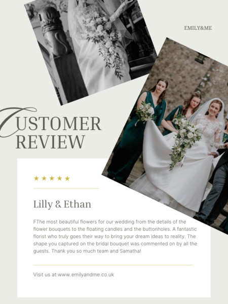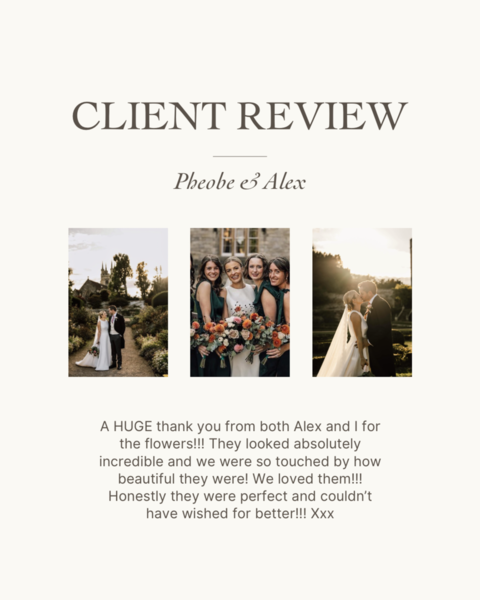 "I just wanted to say thank you so much for our beautiful wedding flowers, we really couldn't have asked for more, they were truly amazing. The style and colours in the bouquet and table arrangements went beautifully with the whole day. Everyone commented on how fabulous they were. We couldn't have chosen a better florist for our wedding"